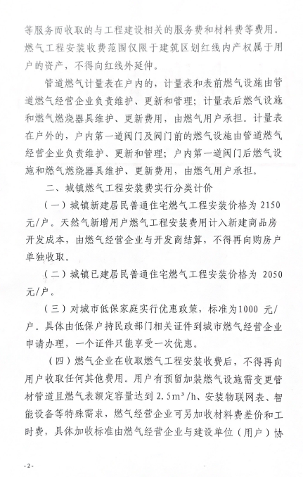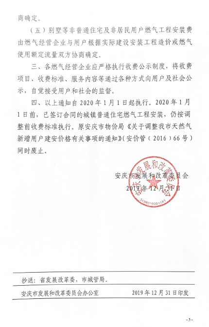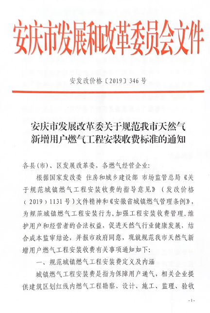 安慶市發(fā)展改革委關(guān)于規(guī)范我市天然氣新增用戶燃氣工程安裝收費標準的通知(2019)