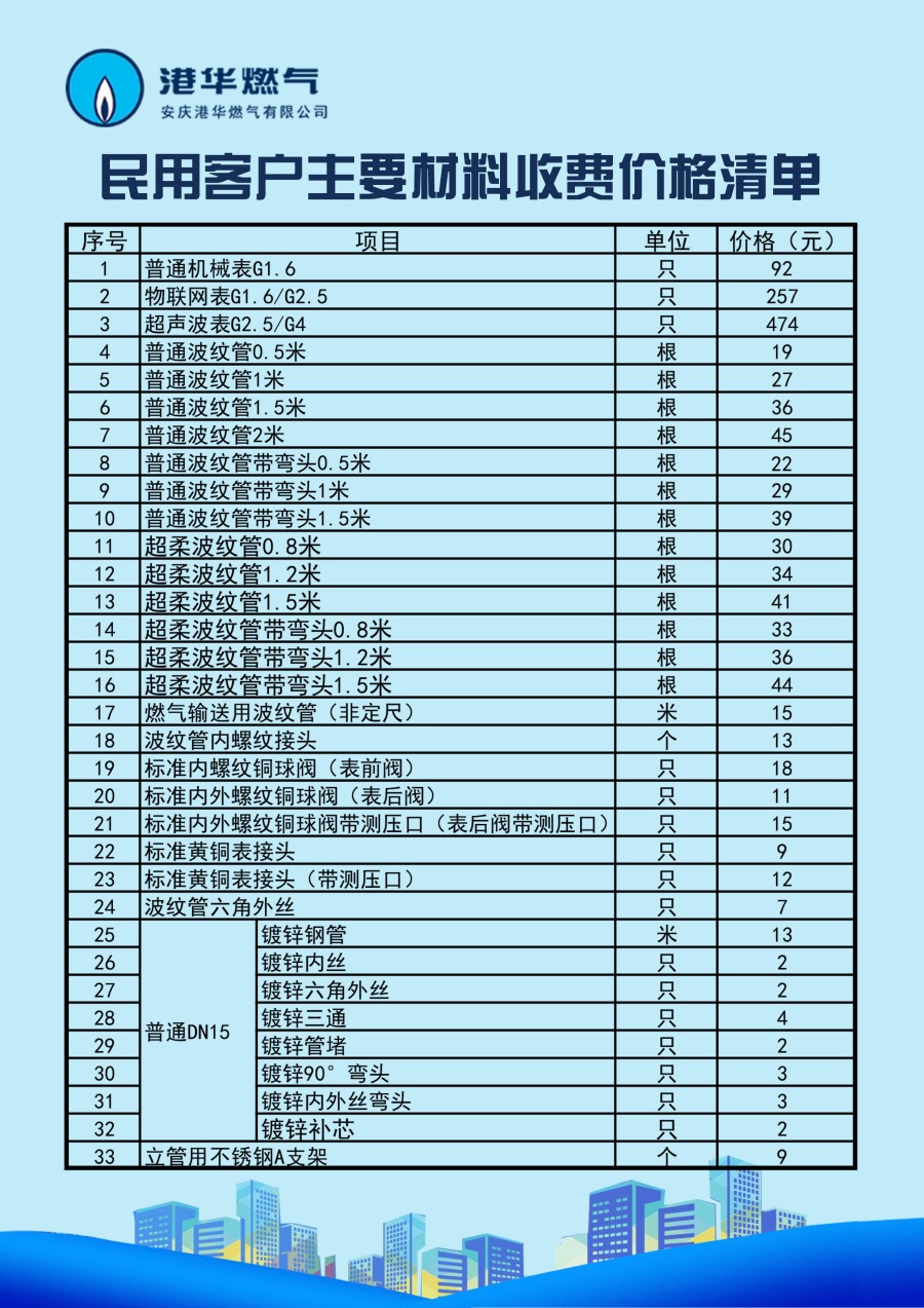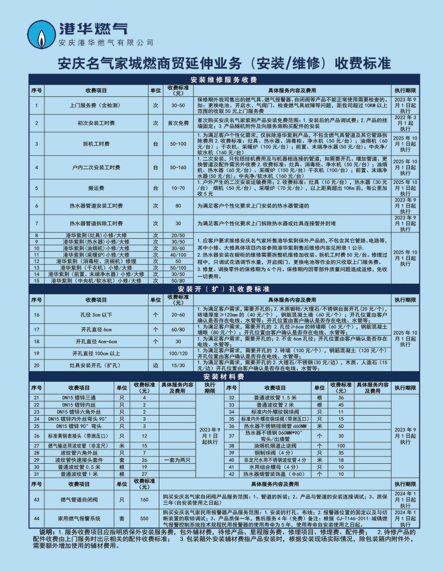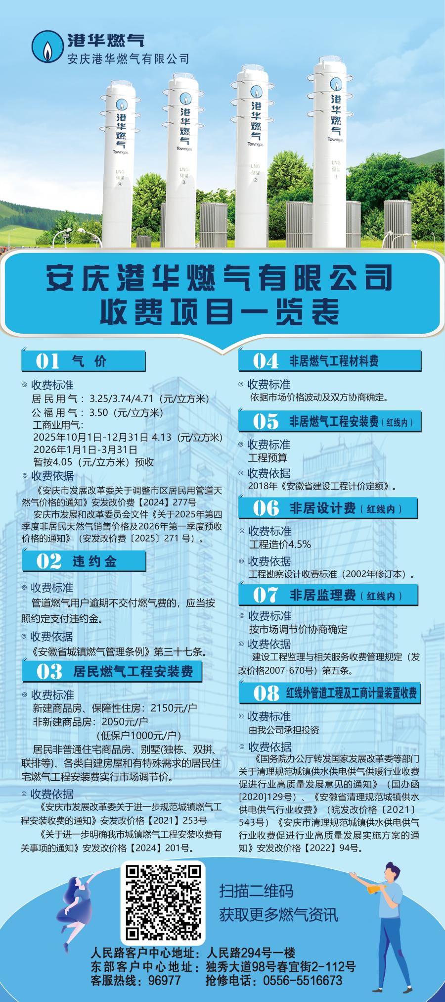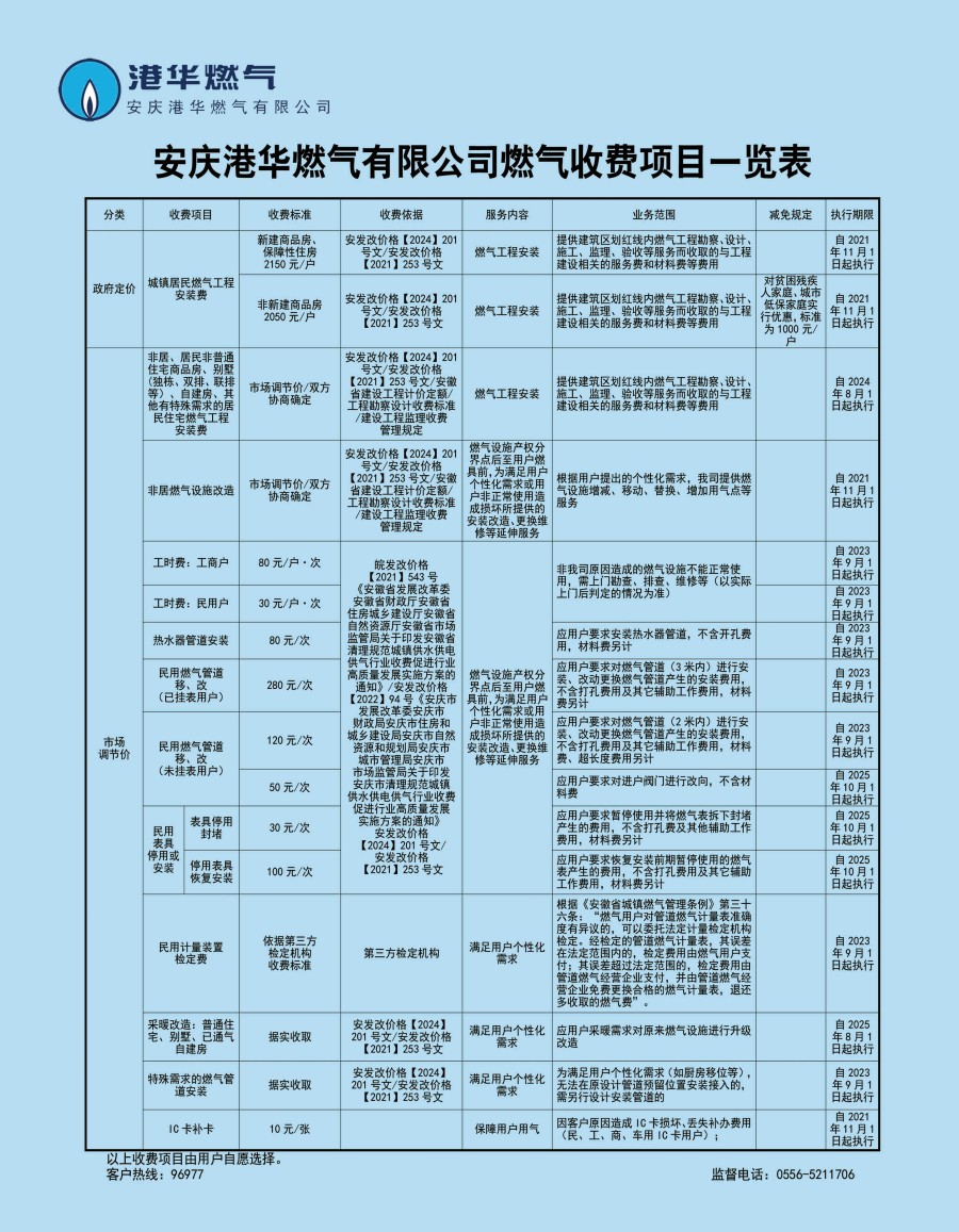 安慶港華燃?xì)庥邢薰臼召M(fèi)項目一覽表(2025)