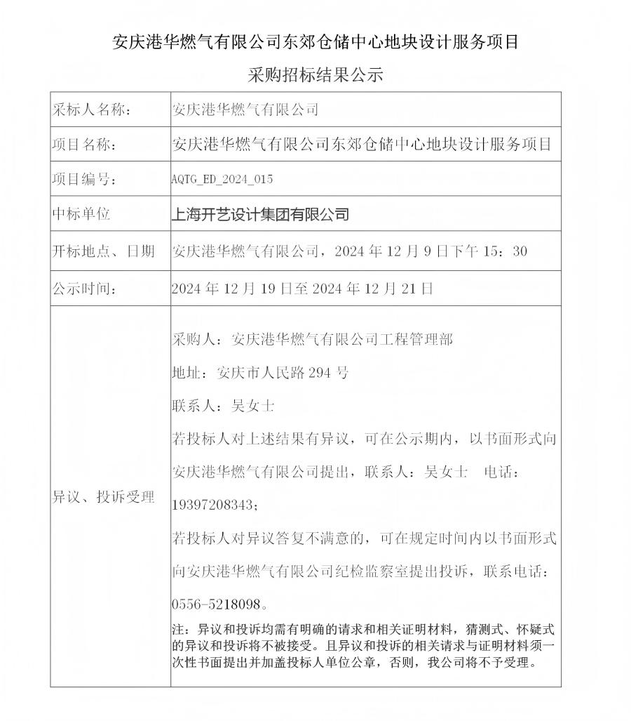 安慶港華燃?xì)庥邢薰緰|郊倉儲中心地塊設(shè)計(jì)服務(wù)項(xiàng)目采購招標(biāo)結(jié)果公示