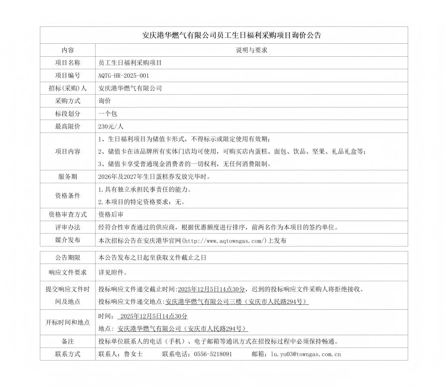 安慶港華燃氣有限公司員工生日福利采購項目詢價公告 發(fā)布時間:2025-11-28    閱讀次數(shù):843次