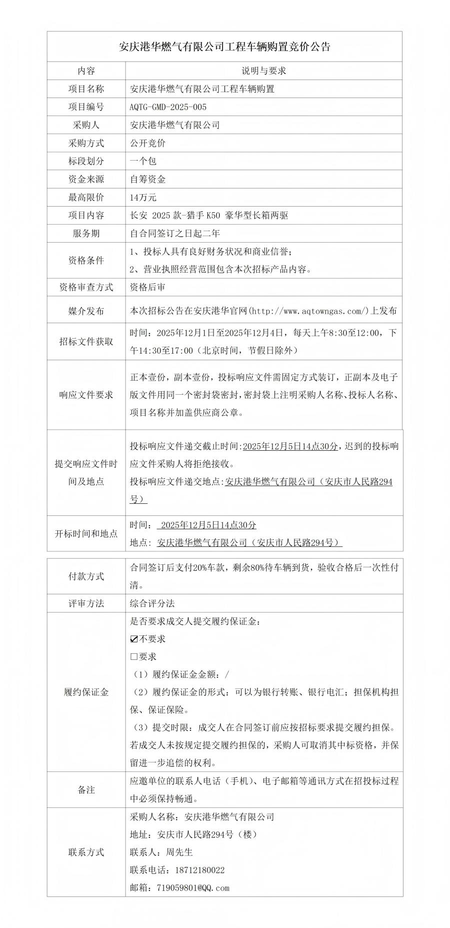安慶港華燃氣有限公司工程車輛購置競價公告