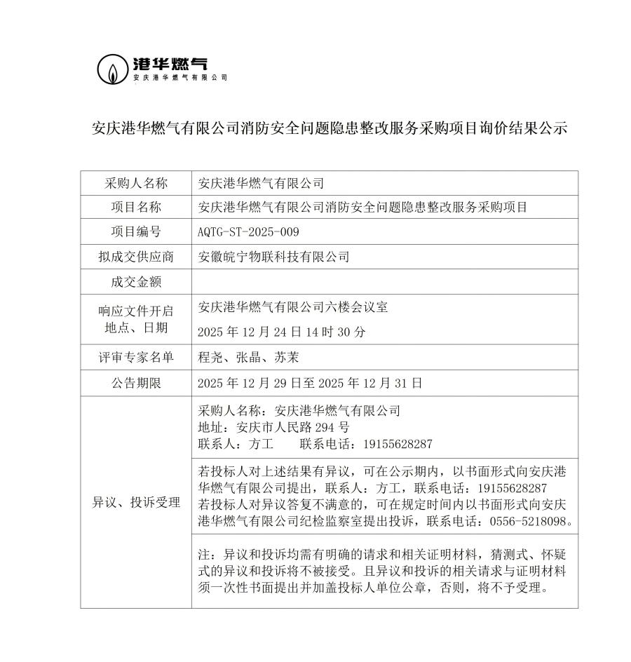 安慶港華燃?xì)庥邢薰鞠腊踩珕栴}隱患整改服務(wù)采購(gòu)項(xiàng)目詢價(jià)結(jié)果公示 發(fā)布時(shí)間:2025-12-29    閱讀次數(shù):582次